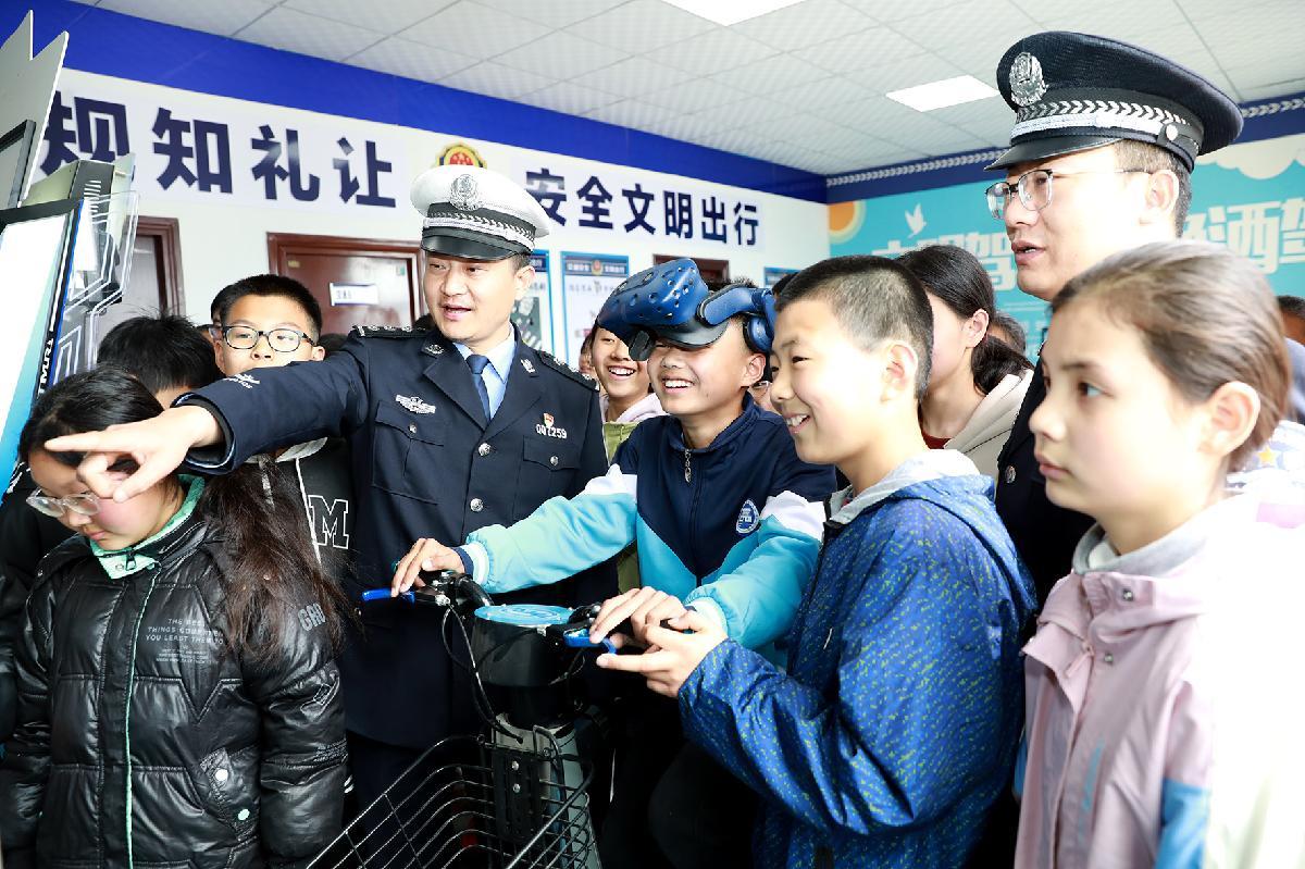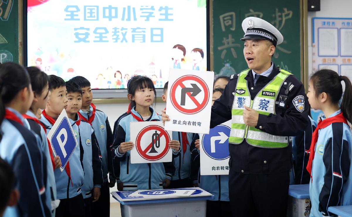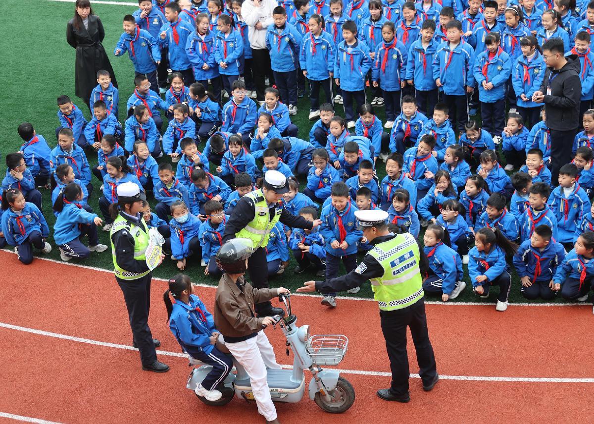 3月30日,在山東省臨沂市郯城縣第三實(shí)驗(yàn)小學(xué),郯城縣公安局交通管理大隊(duì)民警為學(xué)生講解交通安全知識(shí)。