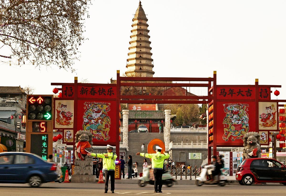 4月5日,山西省運(yùn)城市新絳縣公安局交管大隊(duì)民輔警在絳州古城指揮疏導(dǎo)交通。