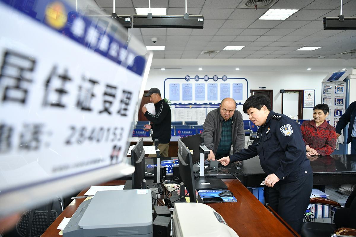 4月5日,安徽省阜南縣政務(wù)服務(wù)中心公安綜合窗口民警為群眾辦理身份證件。