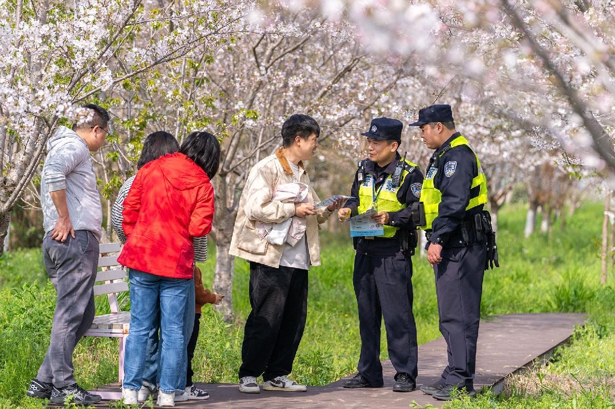 4月4日,上海市公安局崇明分局汲浜派出所民警在櫻花園進(jìn)行常態(tài)化巡邏,并向踏青賞花的游客普及防范電信網(wǎng)絡(luò)詐騙、交通出行安全等知識(shí)。