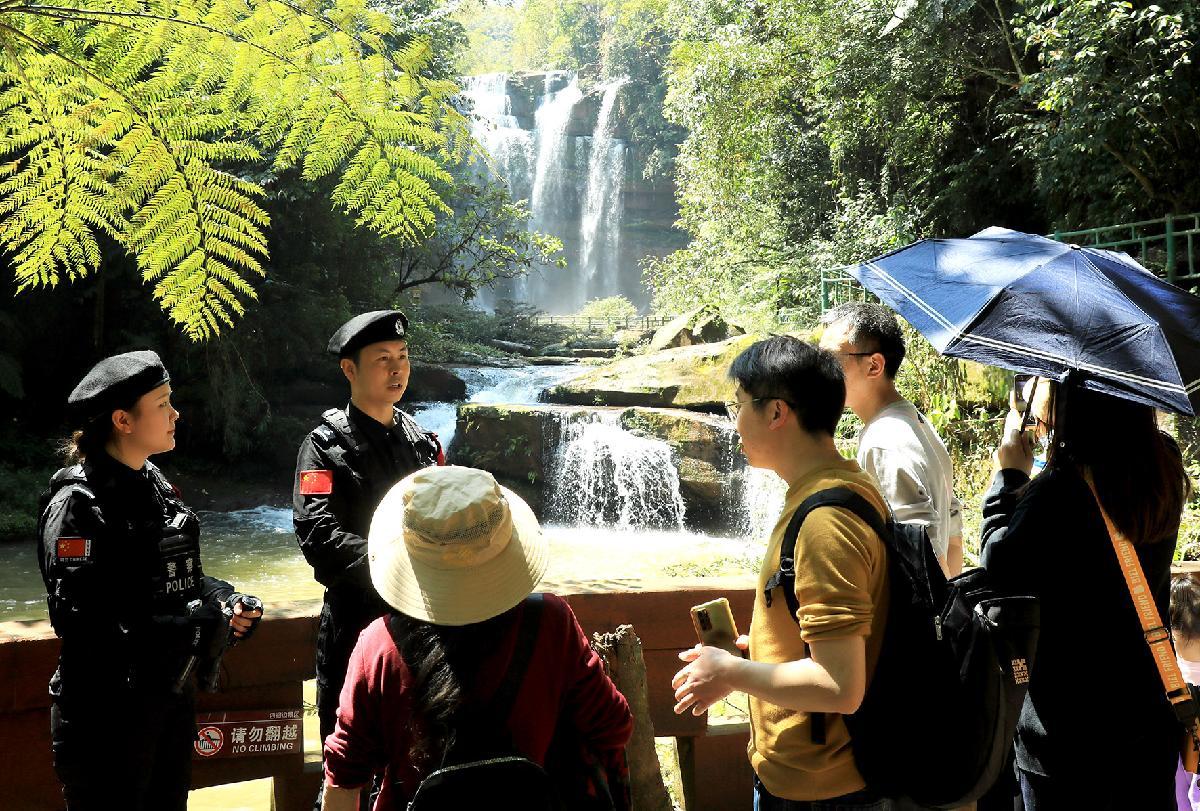 4月4日,貴州省赤水市公安局民警在四洞溝景區(qū)值守,并為游客提供咨詢服務(wù)。