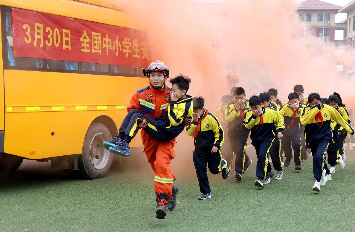 3月30日,是第31個(gè)全國中小學(xué)生安全教育日。山東省棗莊市市中區(qū)東湖小學(xué)學(xué)生在消防救援人員的引導(dǎo)下進(jìn)行校車應(yīng)急逃生演練。