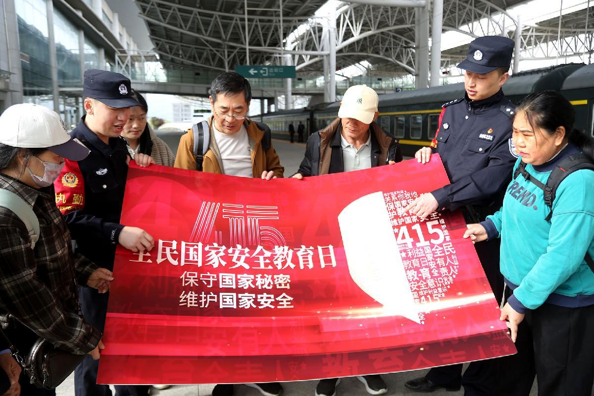4月14日,徐州鐵路公安處連云港東站派出所民警為旅客講解國(guó)家安全知識(shí)。