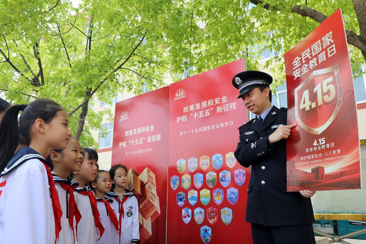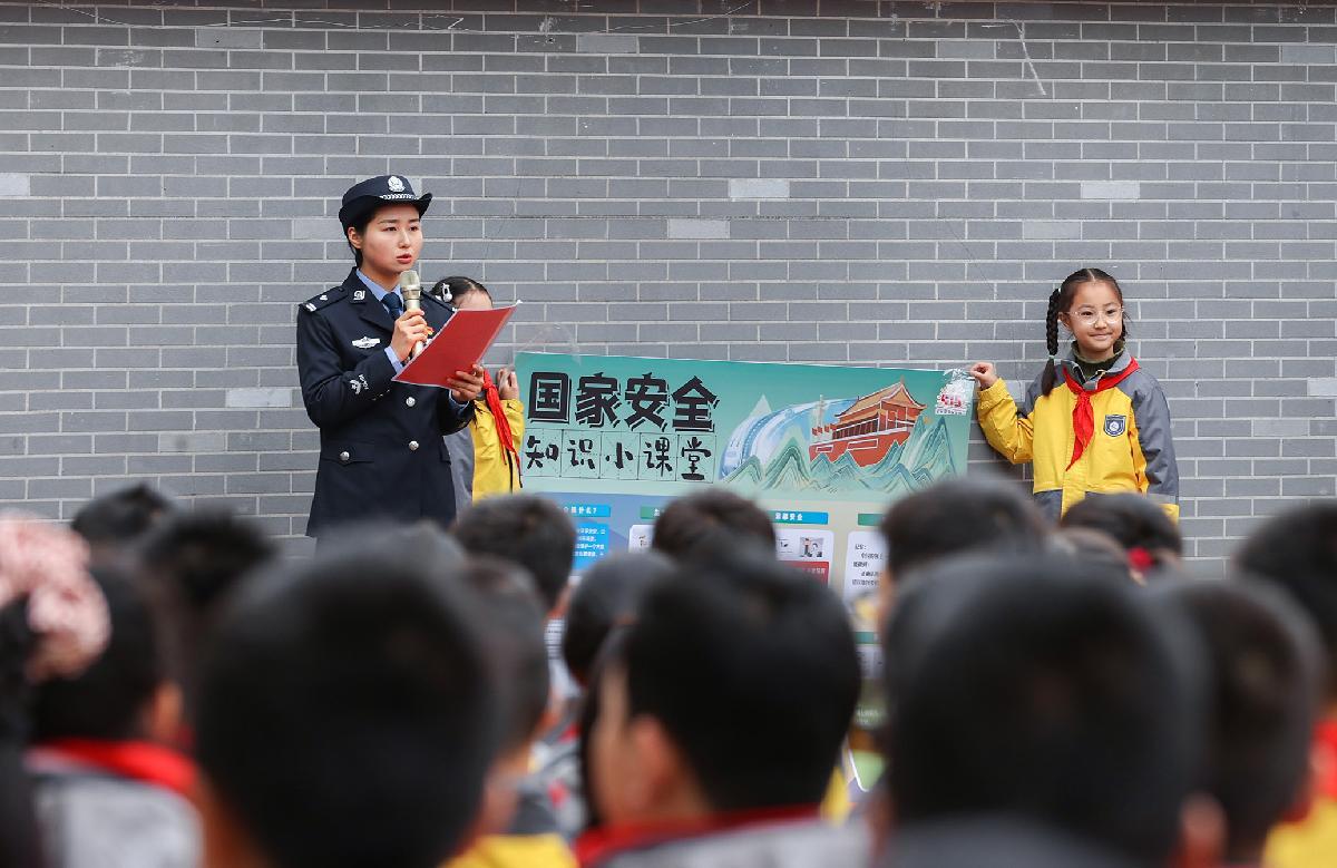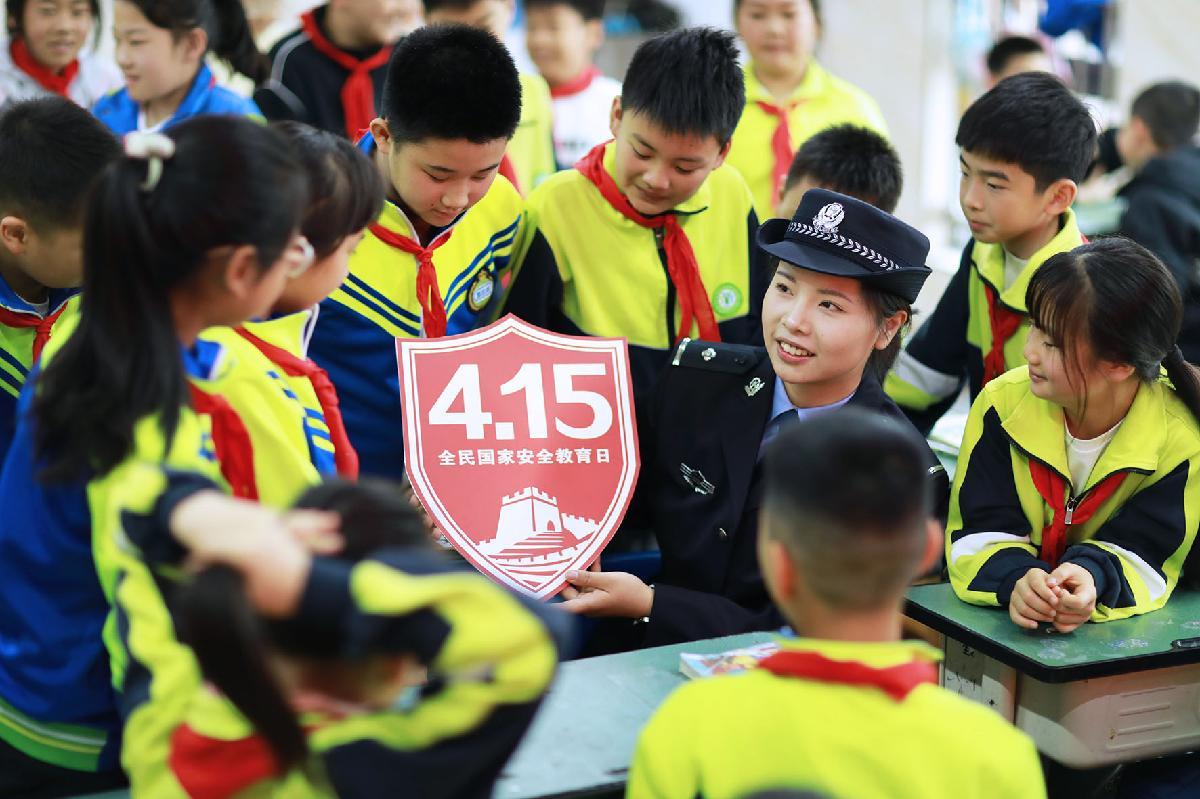 4月14日,在山東省濱州市博興縣第一小學(xué),博興縣公安局民警為小學(xué)生普及國(guó)家安全相關(guān)知識(shí)。