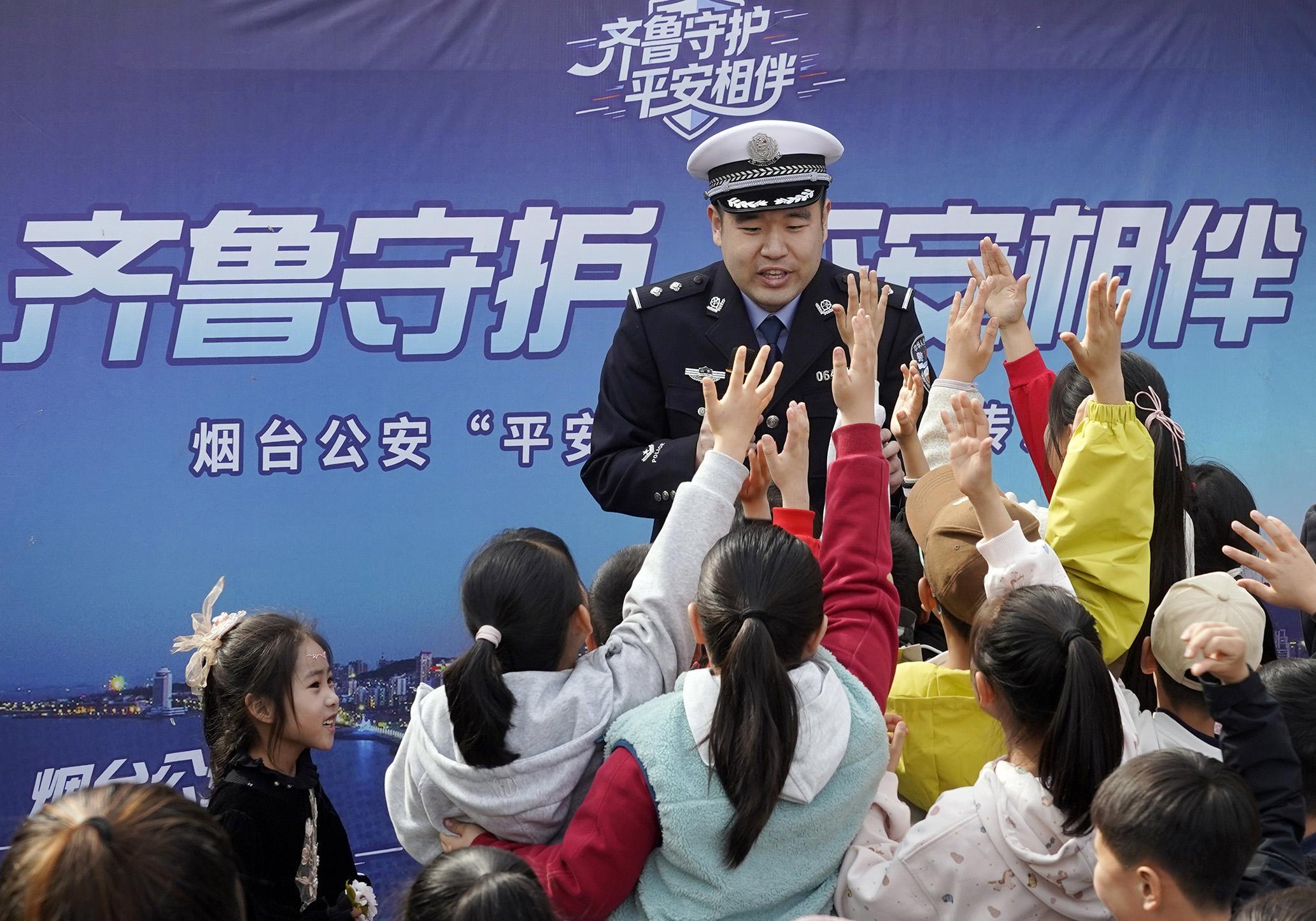 4月11日,山東省煙臺(tái)市公安局在牟平區(qū)龍湖櫻花大道舉辦“齊魯守護(hù)·平安相伴”春日游園會(huì),現(xiàn)場(chǎng)小朋友積極參與交通安全游戲。