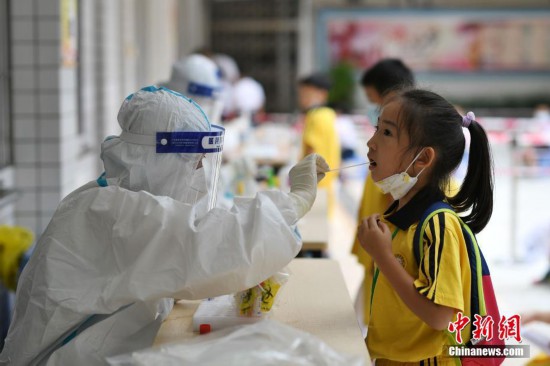 8月28日,學(xué)生在廣東省廣州市越秀區(qū)育才學(xué)校做核酸檢測。為進一步做好中小學(xué)、幼兒園秋季學(xué)期開學(xué)新冠肺炎疫情防控工作,廣州多區(qū)開展全體師生員工核酸檢測。 中新社記者 陳楚紅 攝