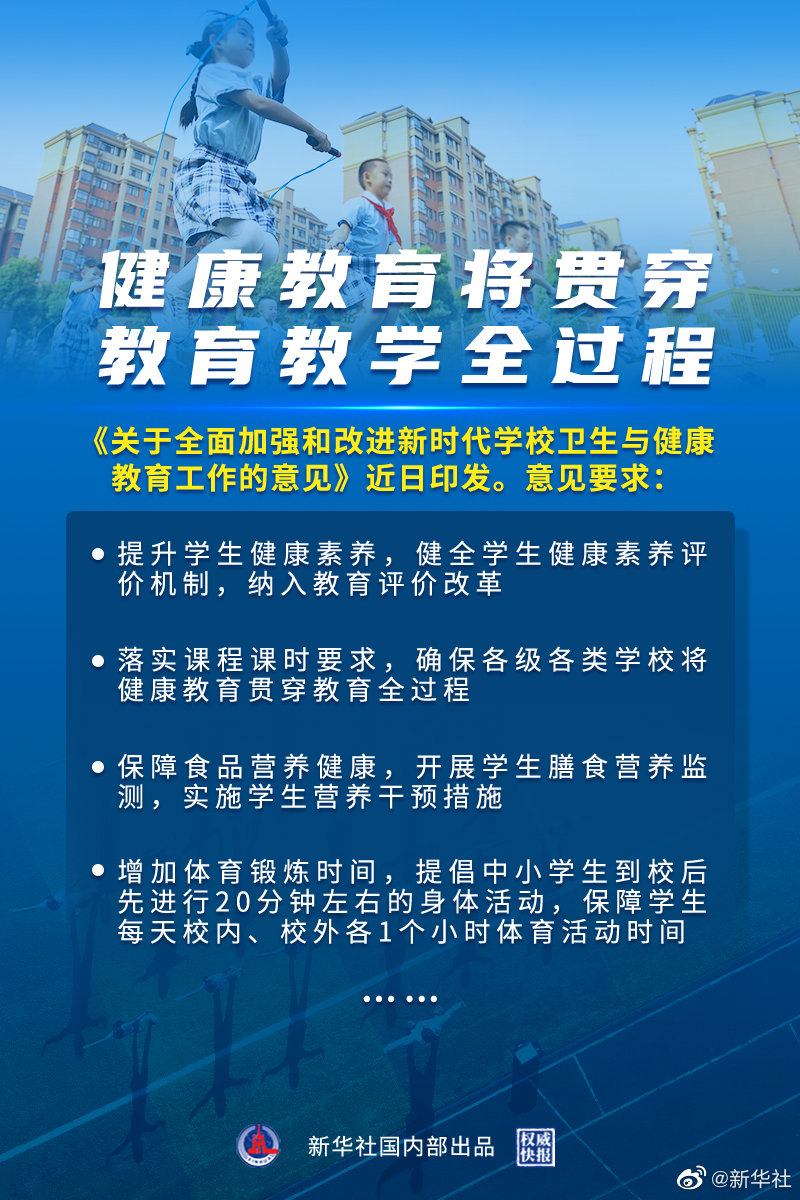 記者3日從教育部新聞發(fā)布會獲悉,《關(guān)于全面加強(qiáng)和改進(jìn)新時代學(xué)校衛(wèi)生與健康教育工作的意見》近日印發(fā)。意見要求,將健康教育與德育、智育、體育、美育、勞動教育相結(jié)合,融入教育教學(xué)、管理服務(wù)全過程。①提升學(xué)生健康素養(yǎng),健全學(xué)生健康素養(yǎng)評價機(jī)制,納入教育評價改革。②明確健康教育內(nèi)容。③落實(shí)課程課時要求,確保各級各類學(xué)校將健康教育貫穿教育全過程。④拓展健康教育渠道。⑤保障食品營養(yǎng)健康,開展學(xué)生膳食營養(yǎng)監(jiān)測,實(shí)施學(xué)生營養(yǎng)干預(yù)措施。⑥增加體育鍛煉時間,提倡中小學(xué)生到校后先進(jìn)行20分鐘左右的身體活動,保障學(xué)生每天校內(nèi)、校外各1個小時體育活動時間。⑦強(qiáng)化心理健康教育。⑧養(yǎng)成健康行為習(xí)慣。(記者胡浩,海報設(shè)計楊軼群)