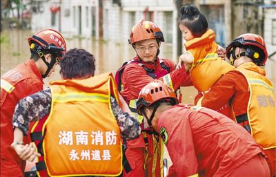 21日,湖南省永州市道縣西洲街道石廚頭社區(qū),消防救援人員在轉(zhuǎn)移群眾。