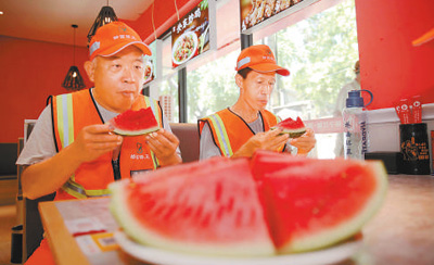石家莊市橋西區(qū),環(huán)衛(wèi)職工正在“愛心驛站”里吃西瓜解暑。