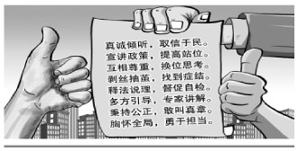 真誠(chéng)傾聽,取信于民。宣講政策,提高站位。互相尊重,換位思考。剝絲抽繭,找到癥結(jié)。釋法說理,督促自檢。多方引導(dǎo),專家講解。秉持公正,敢叫真章。胸懷全局,勇于擔(dān)當(dāng)。