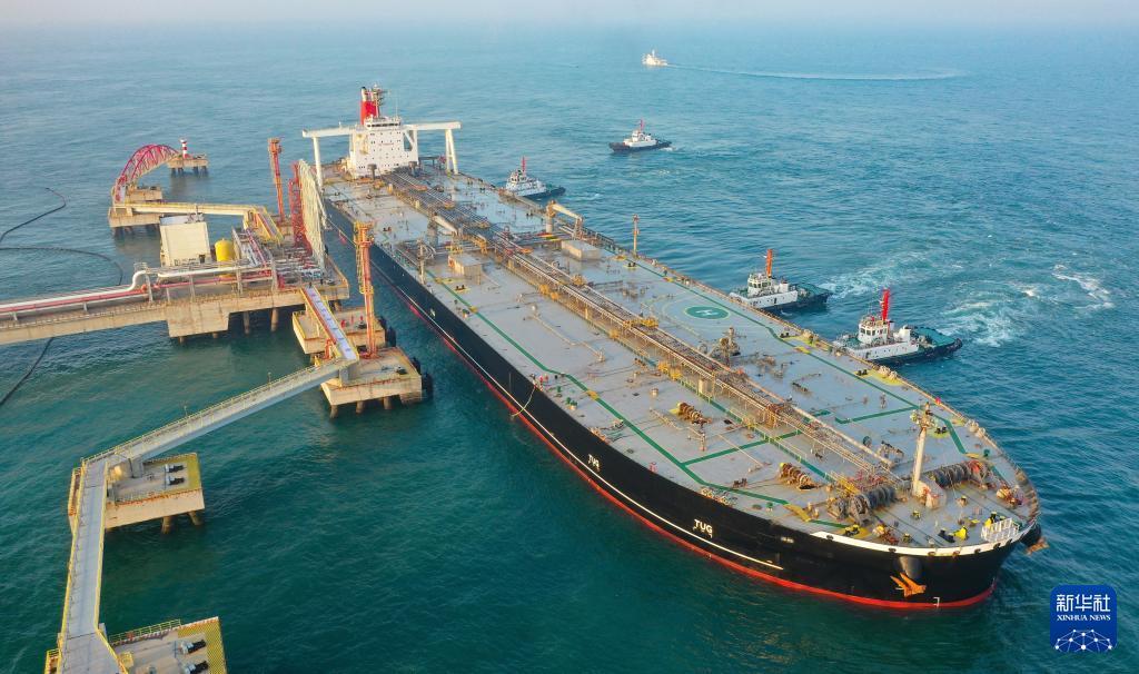 12月18日,一艘裝載著石化原輔料的外籍船舶泊入國投洋浦油儲(chǔ)碼頭30萬噸級(jí)原油泊位(無人機(jī)照片)。新華社記者 郭程 攝