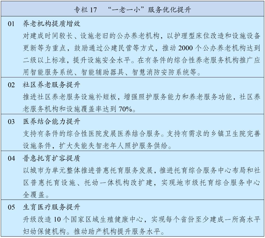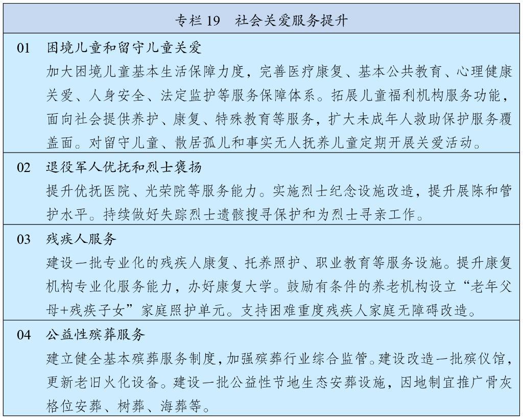 完善殘疾人社會保障制度和關愛服務體系,促進殘疾人事業(yè)全面發(fā)展。強化對重度殘疾、多重殘疾、一戶多殘等群體兜底保障,健全困難殘疾人生活補貼、重度殘疾人護理補貼制度及補貼標準動態(tài)調整機制,加強殘疾兒童康復救助,健全殘疾人輔助器具適配補貼制度。完善殘疾人社區(qū)和家庭支持,加強重度殘疾人托養(yǎng)照護,發(fā)展精神障礙社區(qū)康復。強化殘疾人就業(yè)幫扶,完善按比例就業(yè)、集中就業(yè)、自主就業(yè)促進機制。發(fā)展殘疾人文化體育。深入推進科技助殘,加強公共設施、信息交流、社會服務無障礙環(huán)境建設。