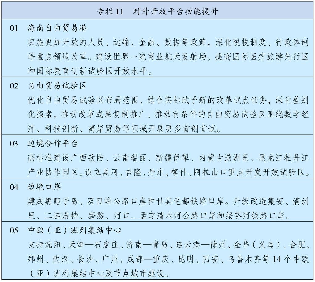 加強港澳與內地經貿、科技、人文等合作,完善便利港澳居民在內地發(fā)展和生活政策措施。有序推進與內地金融市場互聯互通,深化與內地產學研創(chuàng)新協(xié)同。深化粵港澳合作,持續(xù)推動重點領域合作實現突破,促進港口、機場和軌道交通協(xié)同發(fā)展,建設廣州至珠海(澳門)高鐵,推進港深西部鐵路前期工作。深化琴澳一體化發(fā)展,高質量建設前海、南沙、河套等重大合作平臺。建設澳門國際機場橫琴前置貨站,推進澳琴國際教育(大學)城建設,支持澳門高校在橫琴延伸辦學。健全香港、澳門在國家對外開放中更好發(fā)揮作用機制,支持港澳深度參與高質量共建“一帶一路”,發(fā)揮專業(yè)服務優(yōu)勢協(xié)助企業(yè)“走出去”。發(fā)揮港澳在中西文明交流互鑒中的重要窗口作用。