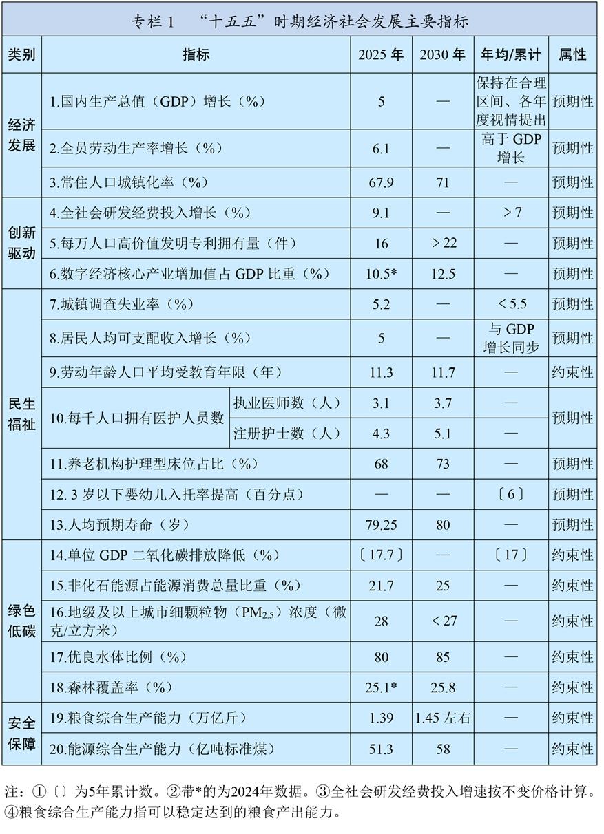 新發(fā)展理念引領作用全面彰顯,構建新發(fā)展格局邁出重要步伐,新質生產力穩(wěn)步發(fā)展,高質量發(fā)展扎實推進。經濟運行穩(wěn)中有進,國內生產總值突破140萬億元,現代化產業(yè)體系建設取得重大進展,基礎設施支撐能力不斷提升,數字經濟核心產業(yè)增加值占比超過10.5%,城鄉(xiāng)區(qū)域發(fā)展平衡性協(xié)調性增強??萍紕?chuàng)新成果豐碩,全社會研發(fā)經費投入強度達到2.8%,攻克一批重大關鍵核心技術,取得一批重大原創(chuàng)科技成果。全面深化改革進一步推進,落實“兩個毫不動搖”的體制機制不斷完善,全國統(tǒng)一大市場建設取得積極成效,宏觀經濟治理效能進一步提升。高水平對外開放不斷擴大,開放型經濟新體制加快形成,高質量共建“一帶一路”走深走實。全過程人民民主深入發(fā)展,全面依法治國有效實施。文化事業(yè)和文化產業(yè)蓬勃發(fā)展,精神文化產品豐富多彩。民生保障扎實穩(wěn)固,居民人均可支配收入年均增長5.4%,城鎮(zhèn)新增就業(yè)累計達到6242萬人,勞動年齡人口平均受教育年限達到11.3年,人均預期壽命提升至79歲以上,脫貧攻堅成果鞏固拓展。綠色低碳轉型步伐加快,生態(tài)環(huán)境質量持續(xù)改善,非化石能源發(fā)電裝機容量超過化石能源,地級及以上城市細顆粒物(PM2.5)濃度降至28微克/立方米,地表水達到或好于Ⅲ類水體比例超過90%,森林覆蓋率超過25%。國家安全能力有效提升,糧食產量邁上1.4萬億斤大臺階,社會治理效能增強,社會大局保持穩(wěn)定。國防和軍隊建設取得重大進展?!耙粐鴥芍啤睂嵺`深入推進。中國特色大國外交全面拓展。全面從嚴治黨成效顯著,反腐敗斗爭縱深推進,黨的創(chuàng)造力、凝聚力、戰(zhàn)斗力明顯提高。