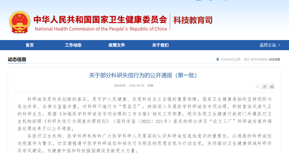 科研誠(chéng)信是科技創(chuàng)新的基石,是守護(hù)人民健康、實(shí)現(xiàn)科技自立自強(qiáng)的重要保障。國(guó)家衛(wèi)生健康委始終堅(jiān)持預(yù)防與懲治并舉、自律與監(jiān)督并重,對(duì)科研不端行為“零容忍”,持續(xù)深入開(kāi)展醫(yī)學(xué)科研誠(chéng)信專項(xiàng)治理,積極營(yíng)造風(fēng)清氣正的科研生態(tài)。根據(jù)《加強(qiáng)醫(yī)學(xué)科研誠(chéng)信專項(xiàng)治理的工作方案》相關(guān)工作部署,現(xiàn)對(duì)各級(jí)衛(wèi)生健康行政部門(mén)所屬醫(yī)療衛(wèi)生機(jī)構(gòu)按照《科研失信行為調(diào)查處理規(guī)則》(國(guó)科發(fā)監(jiān)〔2022〕221號(hào))查實(shí)的部分涉及“論文工廠”科研誠(chéng)信案件調(diào)查處理結(jié)果予以公開(kāi)通報(bào)。