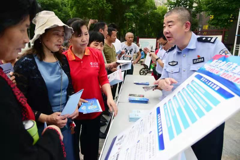 6月3日,江蘇省鎮(zhèn)江市和平路街道征潤(rùn)州社區(qū)聯(lián)合和平路派出所民警和銀行工作人員,開(kāi)展“防電信金融詐騙”宣傳進(jìn)社區(qū)活動(dòng),向居民傳授防電信與金融詐騙相關(guān)知識(shí),支招防詐騙策略與技能。圖為民警向居民宣講防電信詐騙相關(guān)知識(shí)。