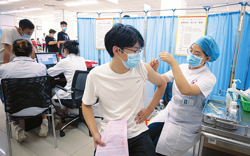 8月3日,在運(yùn)城市中心醫(yī)院新冠病毒疫苗接種門(mén)診,醫(yī)務(wù)人員正為適齡市民接種疫苗。當(dāng)前,根據(jù)全省統(tǒng)一部署,運(yùn)城市8月開(kāi)始在15-17歲人群中接種新冠病毒疫苗。據(jù)悉,該市所有無(wú)禁忌癥的15-17歲人群,由學(xué)校統(tǒng)一組織或自行前往疫苗接種點(diǎn)接種,8月底前完成第一劑接種。(閆鑫攝)