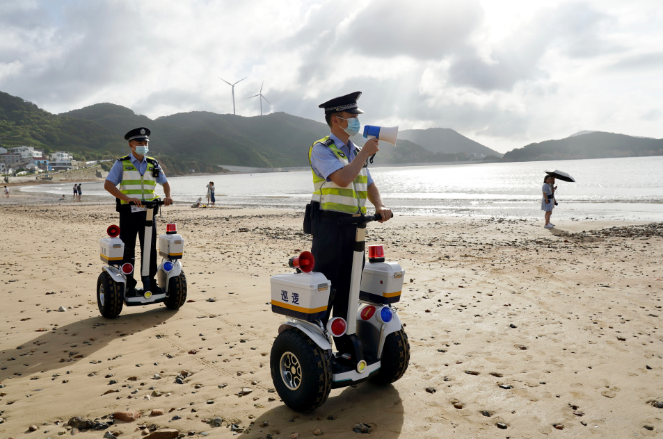 8月5日,浙江省岱山縣公安局羅家岙派出所民警頭頂烈日在轄區(qū)涼峙沙灘巡邏執(zhí)勤,開展相關(guān)法律知識宣傳,提醒在海邊游玩的游客注意天氣變化,守護游客生命財產(chǎn)平安。圖為民警在巡邏執(zhí)勤。