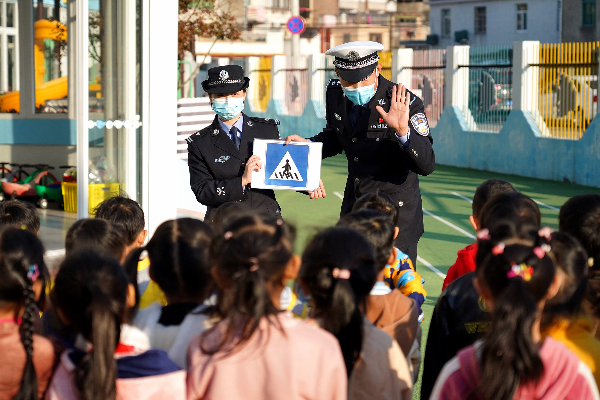 11月11日,浙江省舟山市公安局普陀分局展茅派出所聯(lián)合普陀交警大隊(duì)城北中隊(duì)走進(jìn)轄區(qū)螺門幼兒園,通過課堂教學(xué)、常見交通標(biāo)識講解、戶外模擬場景實(shí)地感受的方式,提升孩子們的交通安全意識。圖為民警向孩子們講解交通標(biāo)識。