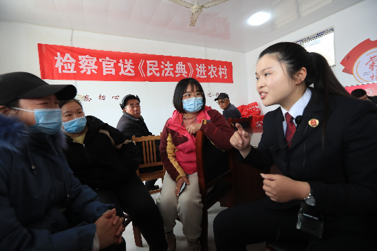 “我能把宅基地賣給城里的堂哥嗎?”“宅基地的房子為啥不能辦抵押貸款?”11月29日,山東省聊城市人民檢察院檢察官走進(jìn)“鄉(xiāng)村振興”幫扶村——高新區(qū)許營鎮(zhèn)龍匯新村,圍繞土地承包經(jīng)營權(quán)、宅基地使用權(quán)等農(nóng)民權(quán)益保障熱點問題,依據(jù)民法典現(xiàn)場解答村民疑問并發(fā)放宣傳資料。圖為檢察官為村民講解相關(guān)法律知識。