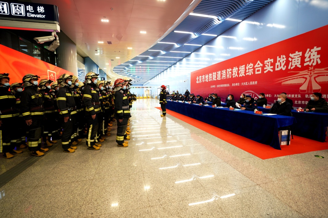 為全力做好2022年春運(yùn)服務(wù)保障工作,防范化解重大安全風(fēng)險,聚焦“全災(zāi)種、大應(yīng)急”救援需要和地鐵隧道火災(zāi)滅火救援處置能力。1月21日凌晨,北京市在北京地鐵大興機(jī)場線大興新城地鐵站組織開展全要素地鐵隧道火災(zāi)滅火救援綜合實戰(zhàn)演練。演練模擬一列由大興新城地鐵站開往草橋站的地鐵因動力電機(jī)故障導(dǎo)致電氣線路起火燃燒,多節(jié)車廂起火,列車、隧道以及車站內(nèi)大量人員被困的情形。北京市消防救援總隊先后調(diào)集10個單位、52輛消防車、248名消防救援人員,以及市軌道運(yùn)營管理公司、公安、交通、環(huán)衛(wèi)、醫(yī)療、氣象、微型消防站等區(qū)級社會聯(lián)動力量200余人參演。