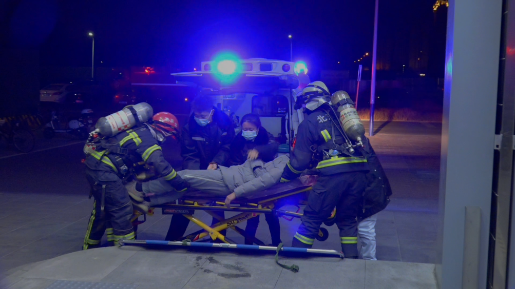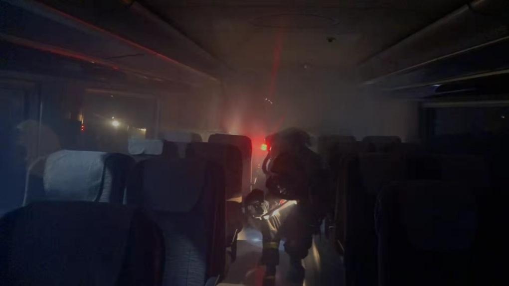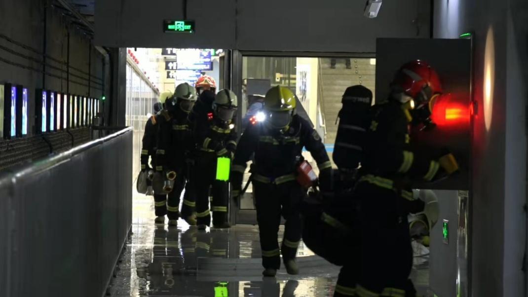 1月21日1時,演練正式開始。一列由大興新城地鐵站開往草橋站的地鐵因動力電機(jī)故障導(dǎo)致電氣線路起火燃燒,高溫?zé)煔庋杆傧蜍噹麅?nèi)蔓延,造成大量乘客被困。發(fā)生火災(zāi)后,大興新城地鐵站值班人員確認(rèn)事故后,立即啟動應(yīng)急處置預(yù)案,停運(yùn)就近線路列車運(yùn)行,并撥打119報警。地鐵工作人員利用應(yīng)急廣播向乘客播報情況穩(wěn)定乘客情緒,車站工作人員啟動應(yīng)急處置,地鐵微型消防站趕赴站臺,疏散站臺乘客,啟動固定消防設(shè)施。119指揮中心接警后立即啟動《北京市地鐵火災(zāi)事故滅火救援預(yù)案》,調(diào)集專業(yè)力量及社會聯(lián)動單位到場協(xié)同處置。消防隊站到場后成立偵查組、搜救組、滅火組、照明組、排煙組、保障組等多個小組,采取“接力疏散、陣地堵截、控?zé)熃禍亍钡燃紤?zhàn)術(shù)措施;搜救組在水槍掩護(hù)下進(jìn)入內(nèi)部偵察火情并優(yōu)先搜救被困人員,啟動接力疏散戰(zhàn)術(shù);滅火組采取“排煙散熱、開辟通道、雙向搜救、分段作業(yè)”等技戰(zhàn)術(shù)措施,利用滅火機(jī)器人、干式泡沫對起火地鐵車輛進(jìn)行滅火處置;轄區(qū)應(yīng)急、公安、交通、環(huán)衛(wèi)、氣象、醫(yī)療等聯(lián)動力量參與行動,提供外圍警戒、交通疏導(dǎo)、醫(yī)療保障等工作。1時35分,明火被撲滅,所有人員全部安全救出,人員得到妥善救助,綜合演練圓滿結(jié)束。