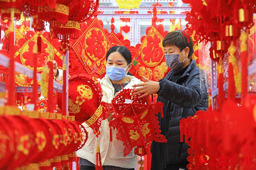 春節(jié)臨近,河北各地賣場里春聯(lián)、福字、紅燈籠、中國結(jié)、剪紙窗花等多種春節(jié)飾品琳瑯滿目,紅彤彤一大片,令人目不暇接,吸引了不少顧客前往選購,裝扮美好的虎年春節(jié)。(付兆颯、張永新)