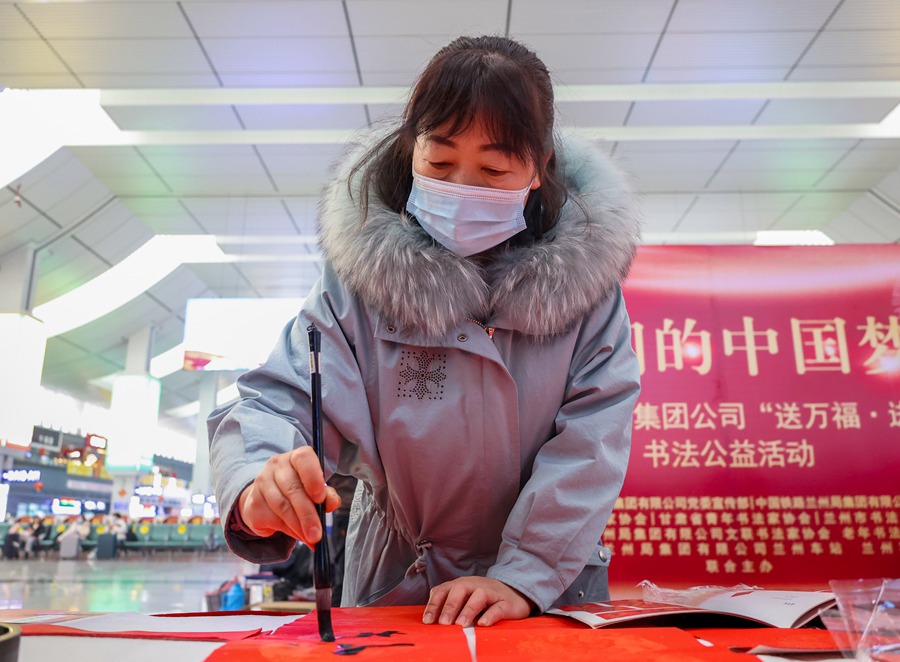 為實(shí)現(xiàn)“平安春運(yùn)、有序春運(yùn)、溫馨春運(yùn),讓旅客體驗(yàn)更美好”的春運(yùn)目標(biāo),1月25日蘭州鐵路局在蘭州火車站、蘭州西站開(kāi)展了以“我們的中國(guó)夢(mèng)”為主題的“送萬(wàn)福·進(jìn)萬(wàn)家”書(shū)法公益活動(dòng)。活動(dòng)當(dāng)天,甘肅省的20余名書(shū)法家、藝術(shù)家筆走龍蛇、揮毫潑墨,現(xiàn)場(chǎng)創(chuàng)作春聯(lián)和“福”字,為候車旅客送上新春的祝福。