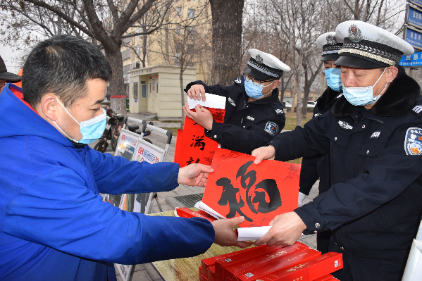 近日,河北省邯鄲市公安局交巡警支隊(duì)磁縣大隊(duì)開展“春聯(lián)送福 春運(yùn)安全”主題宣傳活動(dòng),將春節(jié)祝福和文明出行提醒送給廣大群眾。圖為民警向群眾發(fā)放交通安全折頁和新春對(duì)聯(lián),提醒廣大機(jī)動(dòng)車駕駛員和群眾春節(jié)期間出行注意事項(xiàng)。