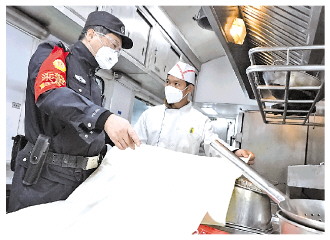 圖為張朝華對(duì)列車餐車的消防設(shè)備進(jìn)行檢查。 通訊員 茍國(guó)力 攝