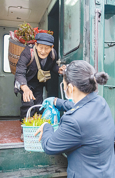 在位于湖南懷化的谷達坡站,乘務(wù)員為乘客遞蔬菜。新華社記者 陳思汗攝