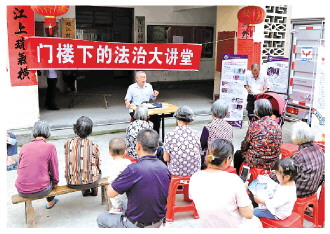 圖為張富成(中)在給村民們講解法律知識。