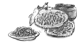十來天后,母親將僵蟲一般的蘿卜條,放進(jìn)沸水里焯一焯,一來祛除濃烈的生辣味兒,讓蘿卜條變得溫順、和氣一些;二來吸納一定的水分,使其變得滋潤、飽滿。瀝干水分后,母親將蘿卜條一股腦倒進(jìn)盆里,加入細(xì)鹽、五香粉和八角等調(diào)料,然后用雙手?jǐn)噭颍?shù)裝入壇子,壓實(shí),封口。