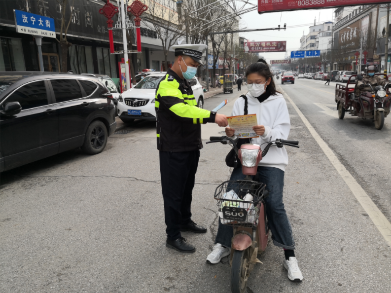 連日來,河南省汝南縣公安局交警大隊民警走上街頭開展“一盔一帶,安全常在”專項宣傳。圖為民警向過往群眾發(fā)放“一盔一帶”交通安全宣傳頁。