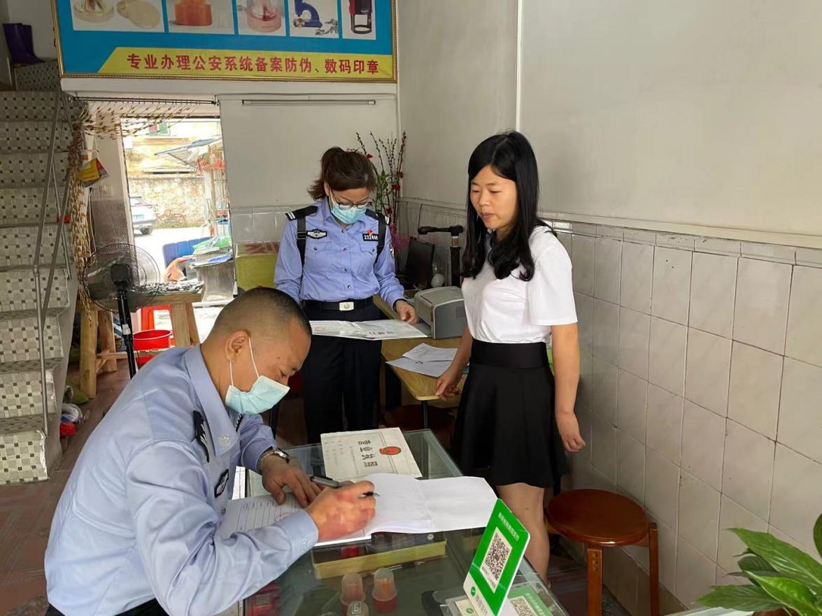 周文輝(左一)在刻章店巡查。公安部供圖
