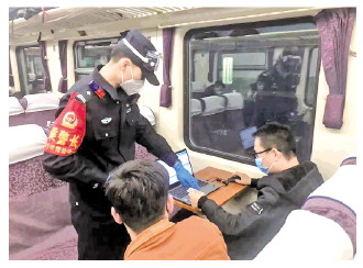 圖② 王旭明在車廂查驗旅客身份信息。