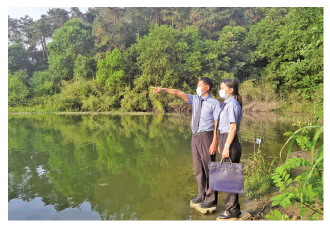 圖② 梁宏偉(左)與同事在淮河支流岸邊研討案件取證問題。