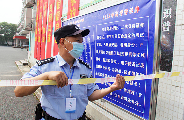 “考試結(jié)束,請考生停止作答?!?月9日上午11時許,隨著考場鈴聲響起,2022年高考最后一場考試結(jié)束了。在護送學(xué)生和家長有序離開后,老吳也用汗水和堅守交出了從警生涯最后一次護航高考的平安答卷。