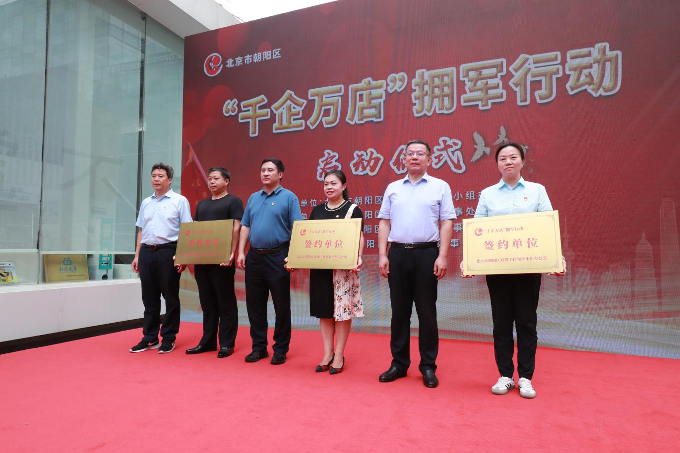 在中國人民解放軍建軍95周年即將到來之際,為提升首都雙擁工作服務(wù)保障力度,進(jìn)一步做好北京市社會化擁軍活動的拓展延伸,7月30日上午,朝陽區(qū)“千企萬店”擁軍行動啟動儀式在三里屯西街隆重舉行。北京市退役軍人事務(wù)局副局長賀軍,市退役軍人事務(wù)局擁軍優(yōu)撫處處長楊樹旺,朝陽區(qū)委常委、武裝部部長王維民,副區(qū)長孟銳,區(qū)退役軍人事務(wù)局局長田志剛,以及三里屯街道、奧運村街道、管莊地區(qū)主要領(lǐng)導(dǎo),簽約單位、駐區(qū)部隊代表參加活動。