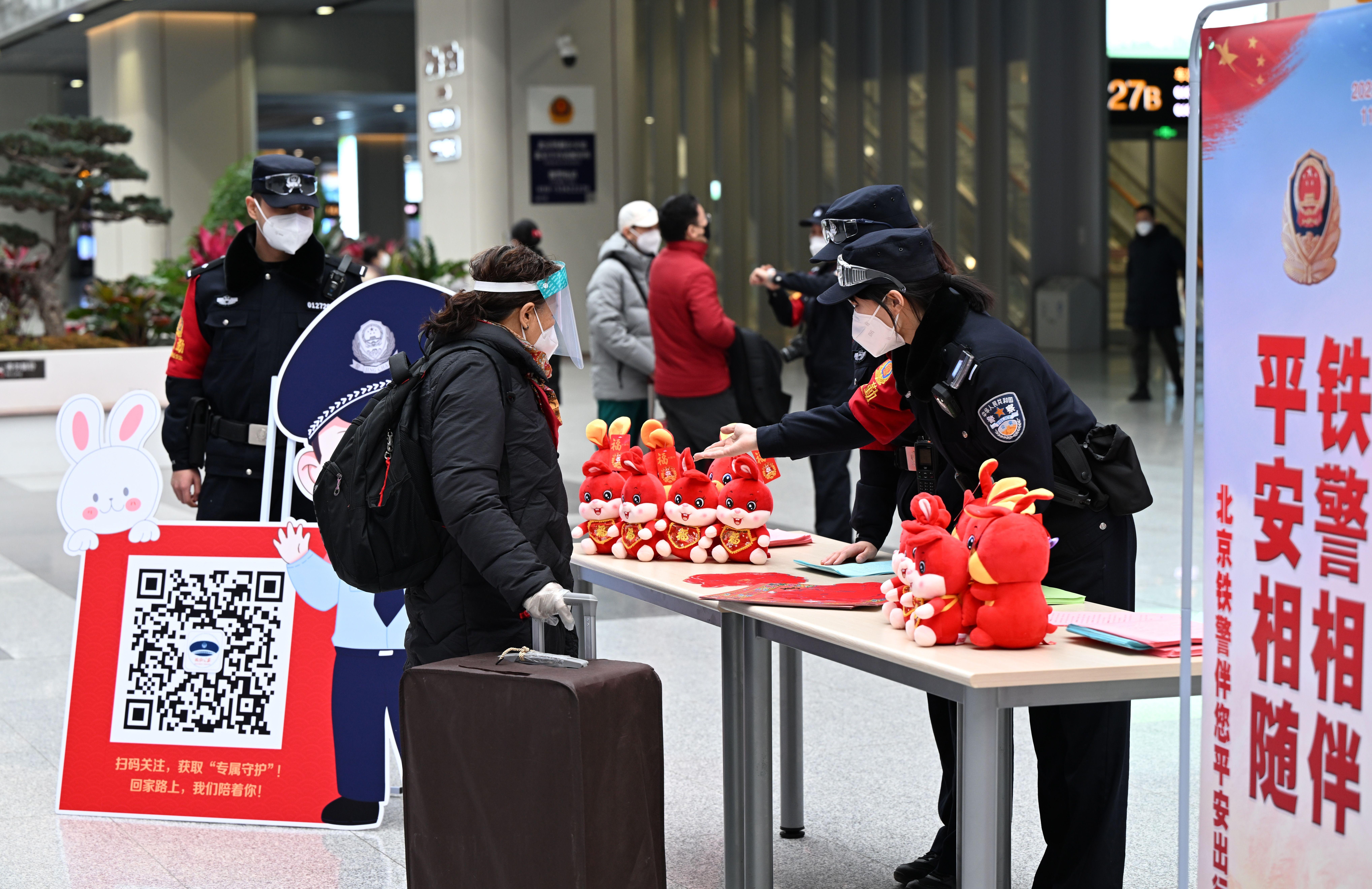 1月7日是春運(yùn)首日,北京鐵路警方在北京站、北京西站、北京南站、北京北站、北京豐臺(tái)站、北京朝陽(yáng)站、清河站、張家口站、承德南站、廊坊站等10大客流集中的火車(chē)站同時(shí)開(kāi)展了春運(yùn)安全宣傳活動(dòng)。圖為豐臺(tái)站派出所民警在“鐵警相伴 平安相隨”宣傳活動(dòng)展臺(tái)前,邀請(qǐng)旅客關(guān)注春運(yùn)便民服務(wù)措施“安全出行”二維碼。