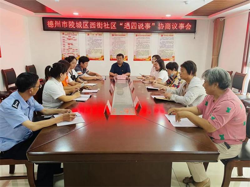 圖為陵城區(qū)建立“遇四說(shuō)事”協(xié)商議事機(jī)制,每月4日、14日、24日由社區(qū)召集居民代表、業(yè)委會(huì)、物業(yè)召開會(huì)議,暢通問題反饋渠道,共商難題破解辦法