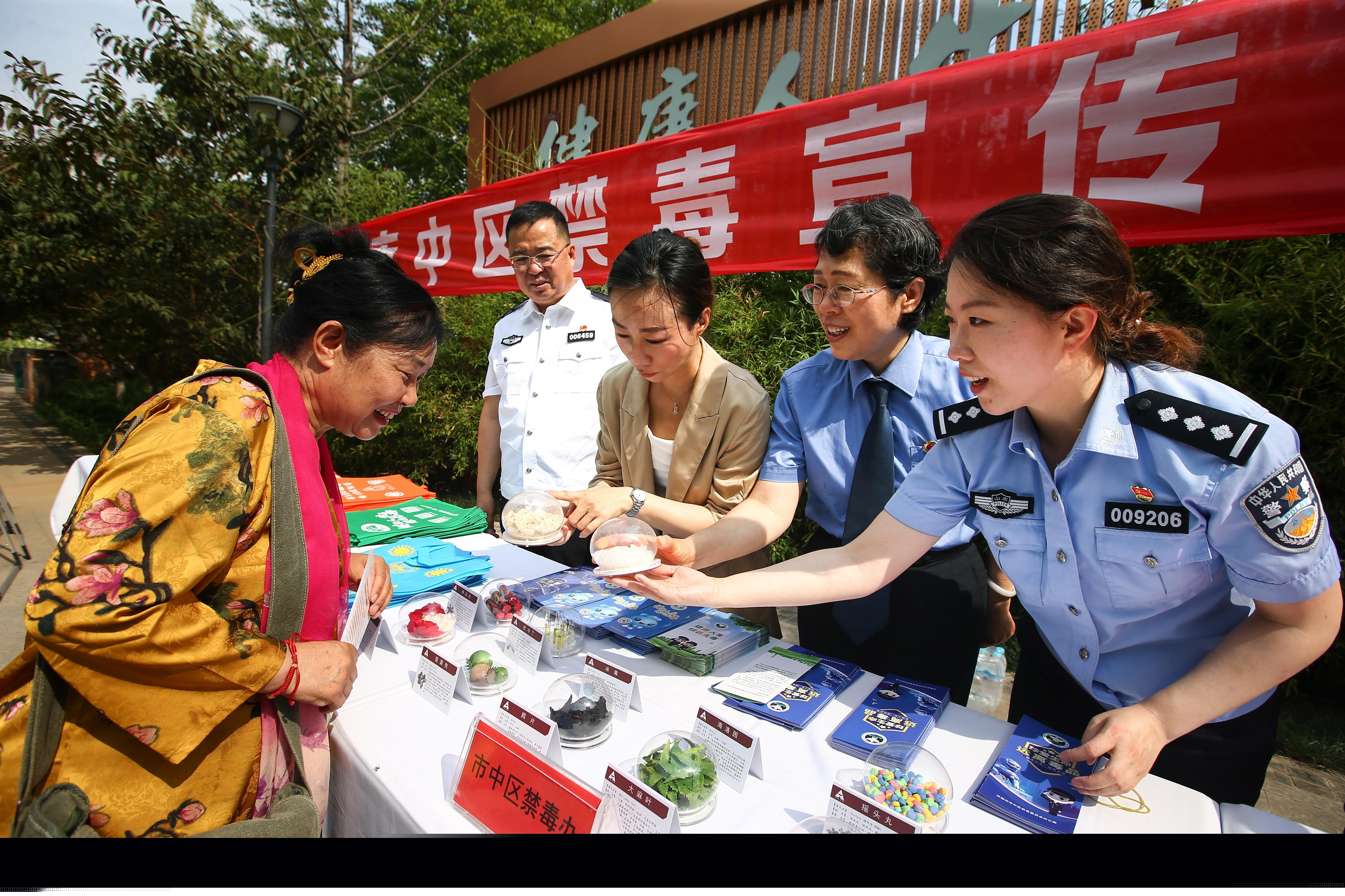6月16日,山東省濟(jì)南市市中區(qū)禁毒辦聯(lián)合濟(jì)南市公安局市中區(qū)分局、市中區(qū)法院、市中區(qū)檢察院在轄區(qū)開展禁毒宣傳進(jìn)社區(qū)活動。工作人員和志愿者通過設(shè)立宣傳展板,發(fā)放宣傳資料和展示仿真毒品模型等方式,向群眾普及禁毒知識,提升群眾禁毒意識。圖為工作人員向群眾展示仿真毒品模型。