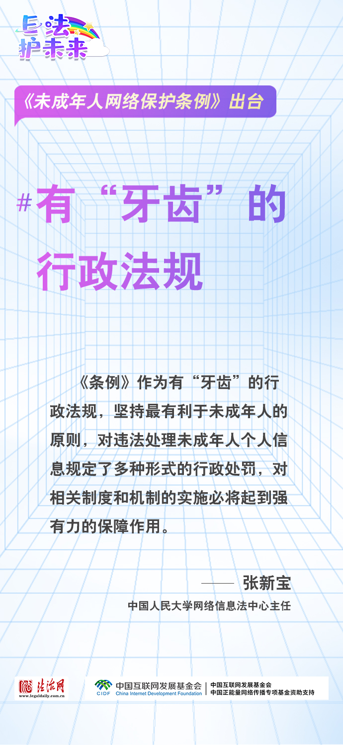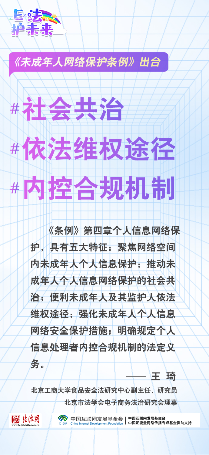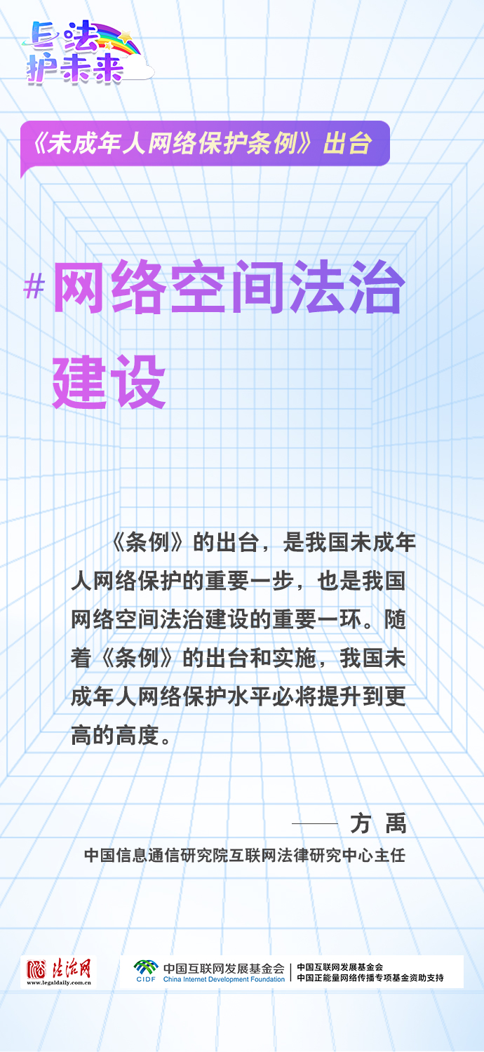 法治網(wǎng)特推出一組“專家有言”海報(bào),內(nèi)容涵蓋《條例》出臺(tái)的現(xiàn)實(shí)意義和時(shí)代價(jià)值、網(wǎng)絡(luò)素養(yǎng)促進(jìn)、網(wǎng)絡(luò)信息內(nèi)容規(guī)范、個(gè)人信息網(wǎng)絡(luò)保護(hù)、網(wǎng)絡(luò)沉迷防治等,充分展現(xiàn)《條例》的出臺(tái)是我國(guó)互聯(lián)網(wǎng)治理領(lǐng)域的法治成果,彰顯中國(guó)在未成年人網(wǎng)絡(luò)保護(hù)領(lǐng)域的擔(dān)當(dāng),為全球未成年人網(wǎng)絡(luò)空間治理提供指引和樣本。