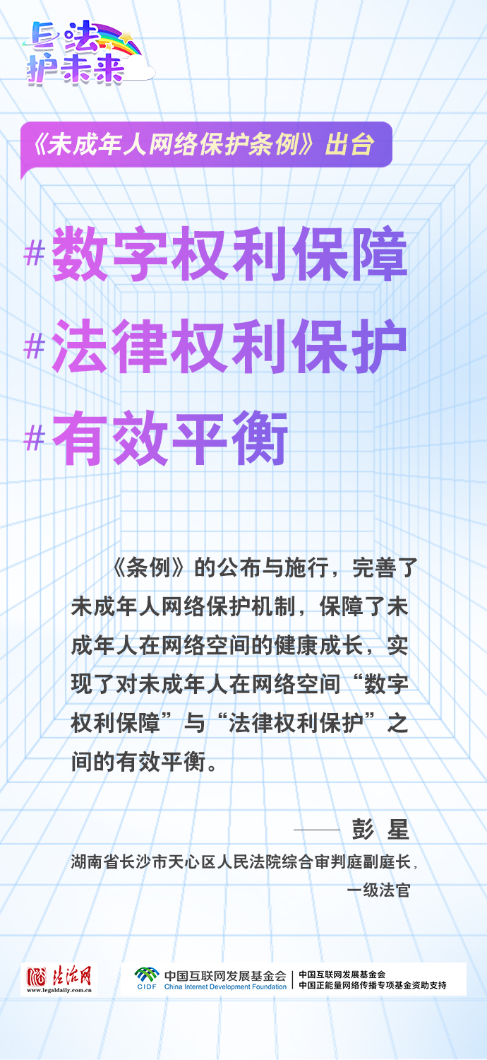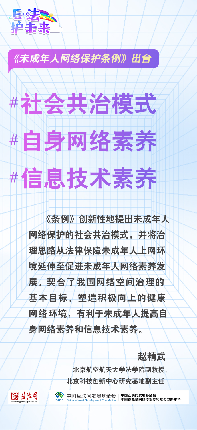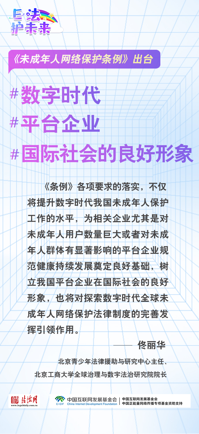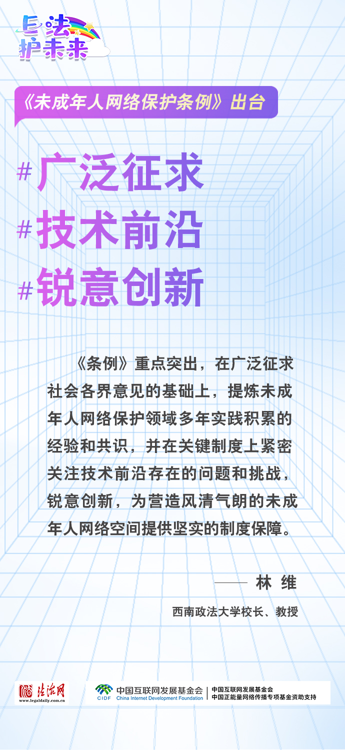 法治網(wǎng)特推出一組“專家有言”海報(bào),內(nèi)容涵蓋《條例》出臺(tái)的現(xiàn)實(shí)意義和時(shí)代價(jià)值、網(wǎng)絡(luò)素養(yǎng)促進(jìn)、網(wǎng)絡(luò)信息內(nèi)容規(guī)范、個(gè)人信息網(wǎng)絡(luò)保護(hù)、網(wǎng)絡(luò)沉迷防治等,充分展現(xiàn)《條例》的出臺(tái)是我國(guó)互聯(lián)網(wǎng)治理領(lǐng)域的法治成果,彰顯中國(guó)在未成年人網(wǎng)絡(luò)保護(hù)領(lǐng)域的擔(dān)當(dāng),為全球未成年人網(wǎng)絡(luò)空間治理提供指引和樣本。
