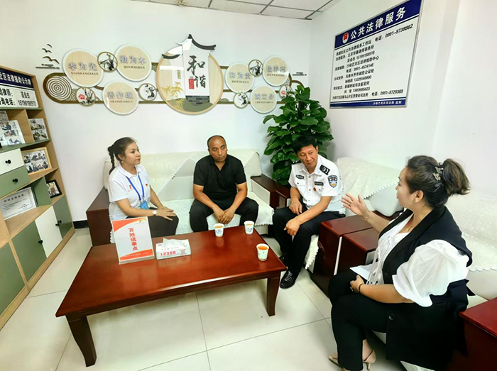 8月24日下午,在烏魯木齊市沙依巴克區(qū)騎馬山街道西盛社區(qū)“百姓說事點(diǎn)”,街道司法所專職人民調(diào)解員楊新團(tuán)(右二)和社區(qū)人民調(diào)解員熱西旦·那斯?fàn)枺ㄗ笠唬┏晒φ{(diào)解一起鄰里之間因噪聲污染引發(fā)的矛盾糾紛。法治日?qǐng)?bào)全媒體記者 潘從武 攝