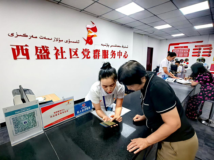 8月24日,烏魯木齊市沙依巴克區(qū)騎馬山街道西盛社區(qū)工作人員正在向轄區(qū)居民介紹“百姓說事云·書記直通車”線上平臺(tái)的使用方法。法治日?qǐng)?bào)全媒體記者 潘從武 攝