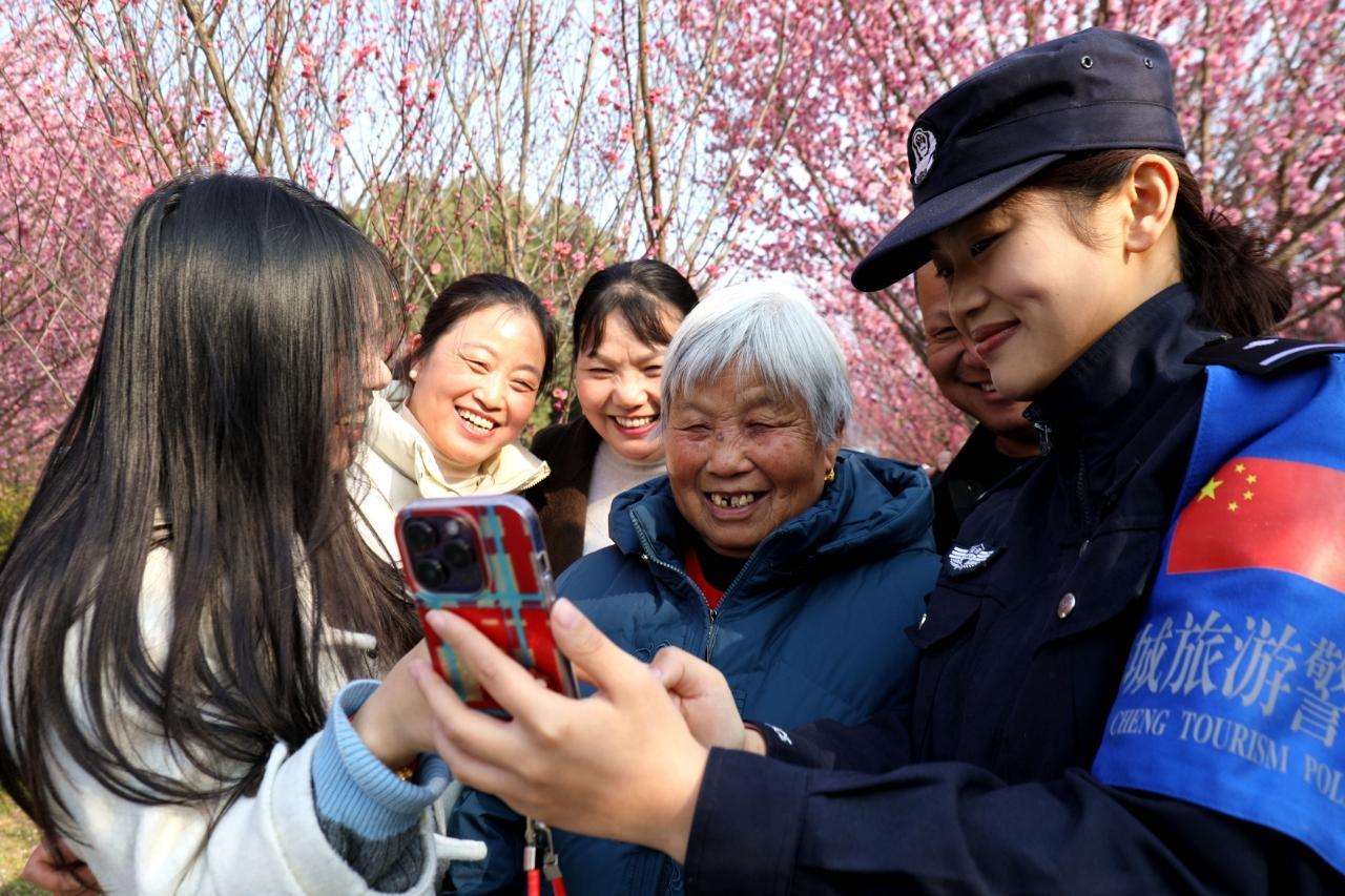 近日,安徽省舒城縣九一六茶園梅花綻放,春意盎然,成為眾多游客的賞花“打卡地”。舒城縣公安局舒茶派出所組織民輔警及時走進景區(qū),開展巡邏守護、服務(wù)群眾。圖為民警展示為群眾拍攝的合影。