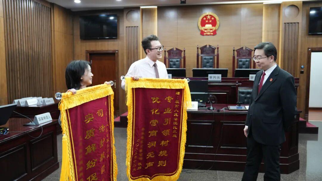 2025年12月24日,最高人民法院第六法庭里,褪去了平日里開庭的嚴(yán)肅,露出鮮有的平和氛圍。楊女士和祁先生各自代表平臺公司和電視公司,分別向最高人民法院民三庭、承辦法官團(tuán)隊贈送錦旗。民三庭庭長李劍代表最高法民三庭接受了錦旗,戴怡婷法官團(tuán)隊接受了贈旗。