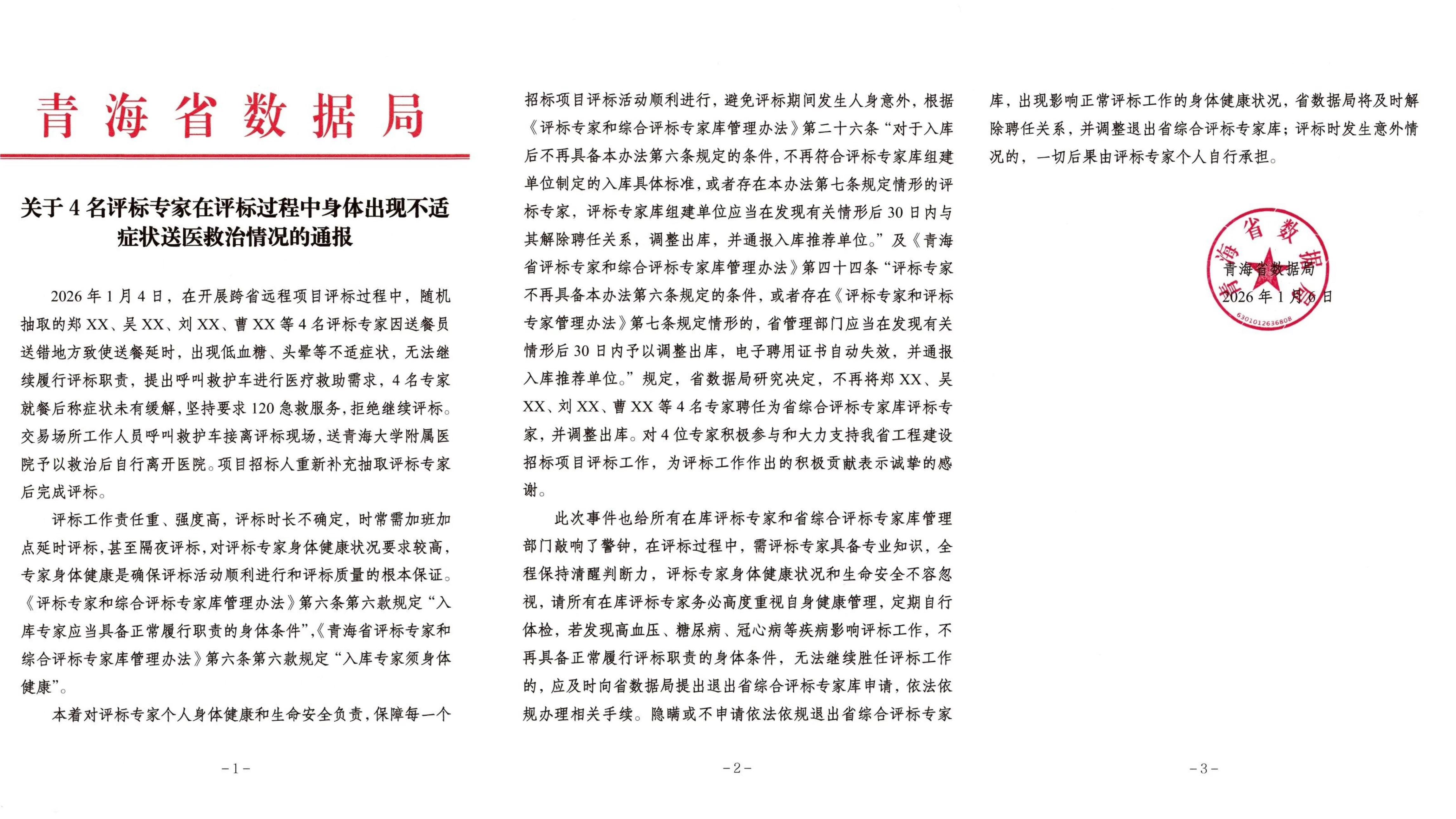 1月7日,青海省數(shù)據(jù)局在青海省公共資源交易網(wǎng)發(fā)布《關(guān)于4名評標(biāo)專家在評標(biāo)過程中身體出現(xiàn)不適癥狀送醫(yī)救治情況的通報》。通報稱,1月4日,4名評標(biāo)專家因送餐延時出現(xiàn)低血糖、頭暈等不適癥狀,無法繼續(xù)履行評標(biāo)職責(zé),提出呼叫救護(hù)車進(jìn)行醫(yī)療救助需求,4名專家就餐后稱癥狀未有緩解,堅持要求120急救服務(wù),拒絕繼續(xù)評標(biāo)。此后交易場所工作人員將其送青海大學(xué)附屬醫(yī)院救治,項目招標(biāo)人重新補(bǔ)充抽取評標(biāo)專家后完成評標(biāo)。通報表示,省數(shù)據(jù)局研究決定,不再將上述4名專家聘任為省綜合評標(biāo)專家?guī)煸u標(biāo)專家,并調(diào)整出庫。