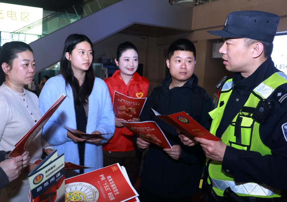 4月13日,武漢鐵路公安處民警、志愿者在湖北省漢口站向旅客宣講防范化解危害國(guó)家安全行為的知識(shí)。新華社發(fā)(趙軍 攝)